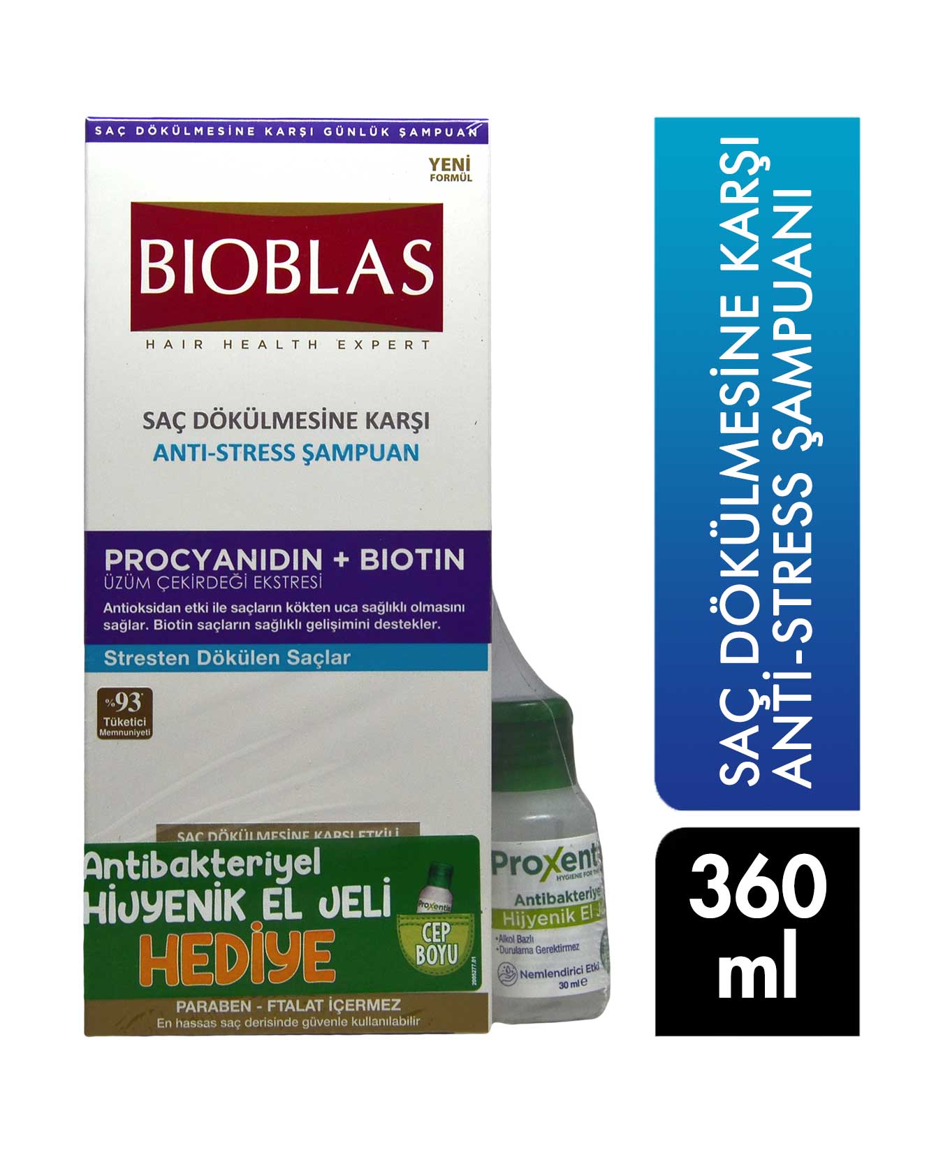 Bioblas Şampuan 360 ml Saç Dökülmesine Karşı Anti-Stress + 30 ml Proxentin Dezenfektan Hediye 8697432096187
