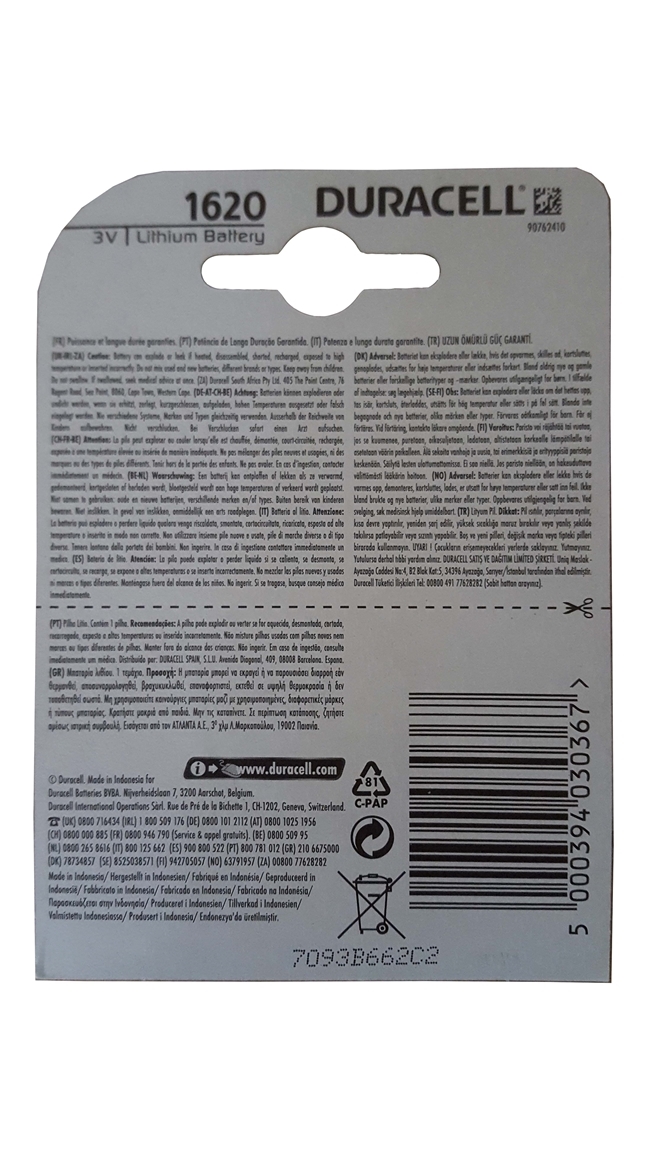 Duracell Lithium CR1620 3 Volt Button Battery has a longer standby and operating time, allowing you to use your devices at full power for longer.