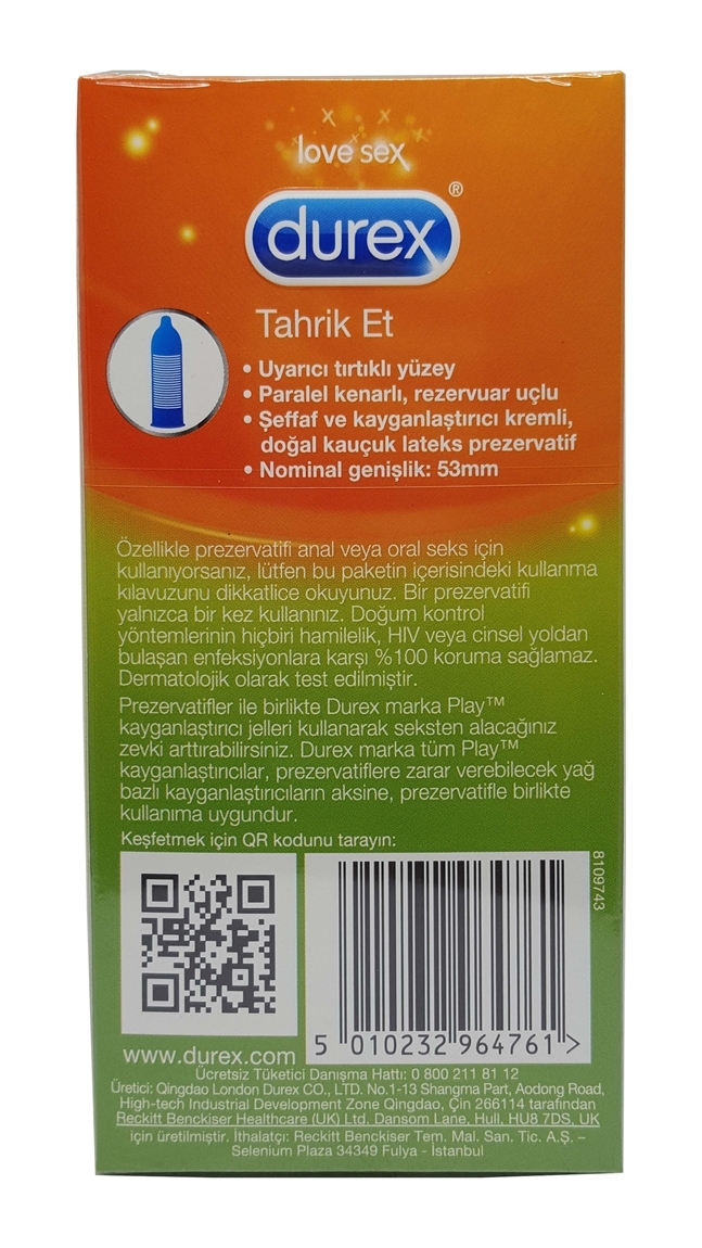 Tırtıklı dış dokuya sahip Durex Tahrik Et Prezervatif kayganlaştırıcı jel içerikli ve dayanıklı lateks malzemesi ile ilişkinizi güvenli ve daha zevkli hale getirmenize yardım eder.