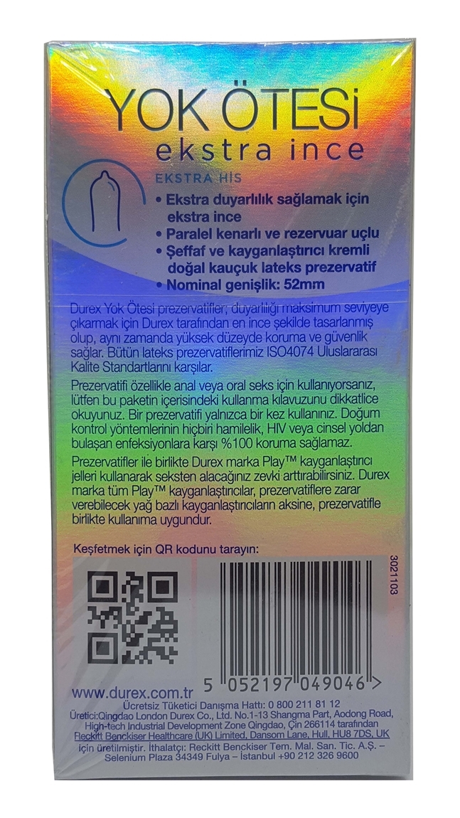 Daha fazla hissetmek isteyen fakat korunmadan ödün vermek istemeyenler için geliştirilen Durex Yok Ötesi Ekstra İnce Prezervatif, süper ince yapısıyla doğal ten hissiyatını engellemez.