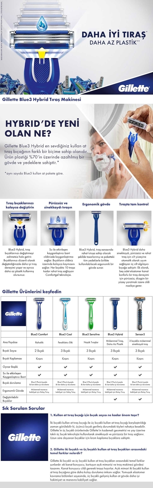 Gillette Blue3 Hybrid Shaver and razor blades provide a perfect shave without irritating with 3 chrome-plated blades placed on the head that can move at an angle of 40 degrees.