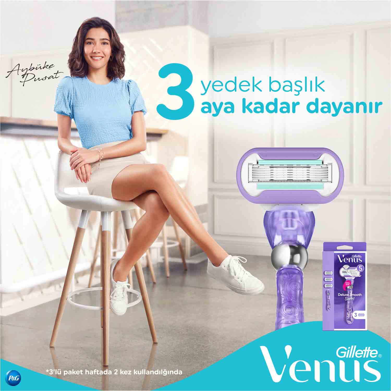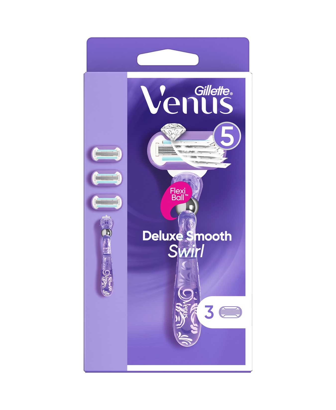 Gillette Venus  Bundle Pack Handle + 3 Refill Razor Blade Swirl Extra Smooth, which has anti-irritating lubricant and moisturizing bands for sensitive skin, adapts to every part of the body thanks to its five-blade Flexball structure and provides long-lasting smoothness.