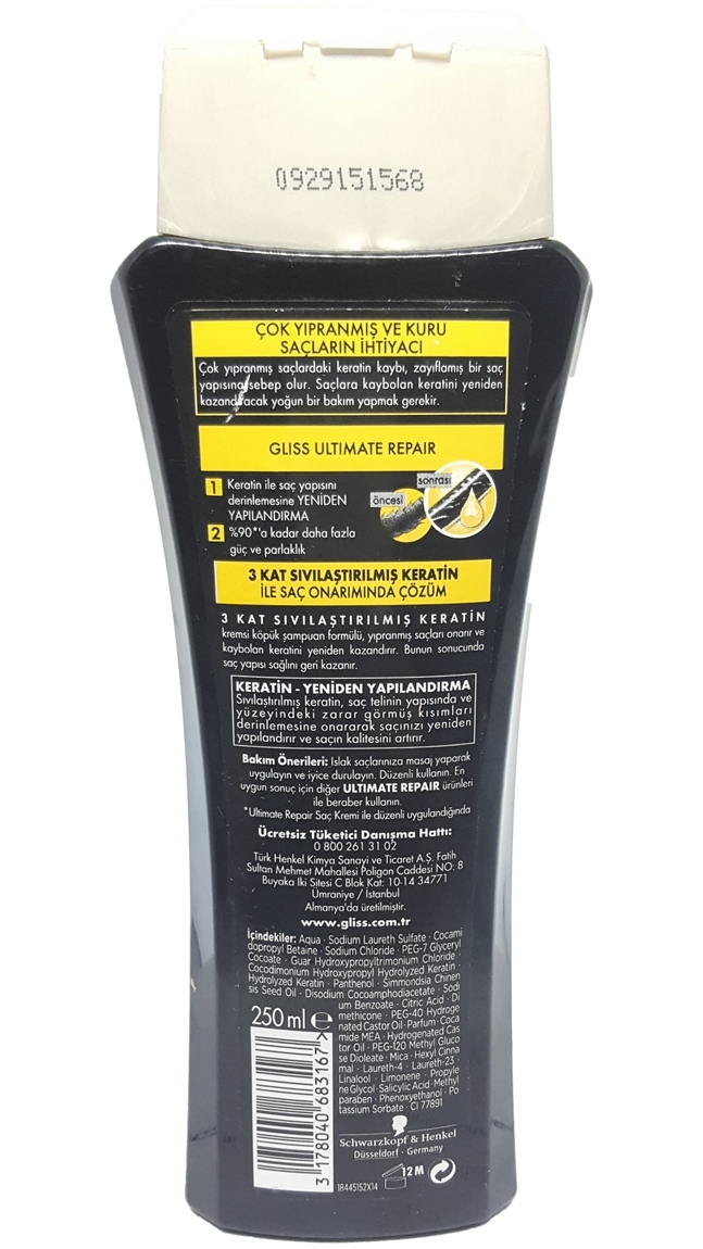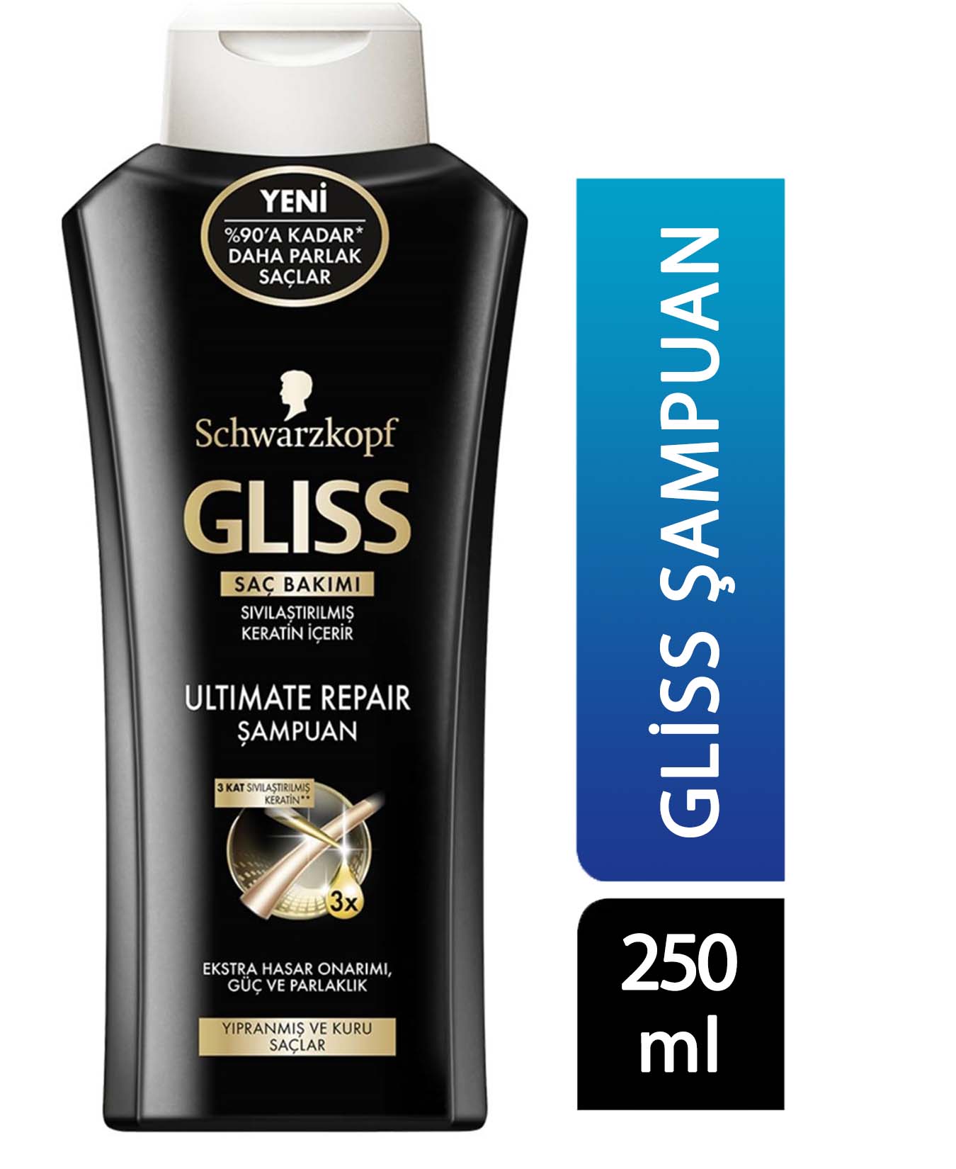 Gliss Ultimate Repair Şampuan içeriğindeki sıvılalaştırılmış keratin ile saçlarınızın doğal sağlığına kavuşmasını sağlar. İçeriğindeki, saçın esas maddesi olan keratin sayesinde, saçlarınızı canlandırır, yeniden hacimli, parlak ve sağlıklı olmalarını sağlar.