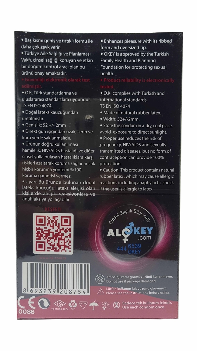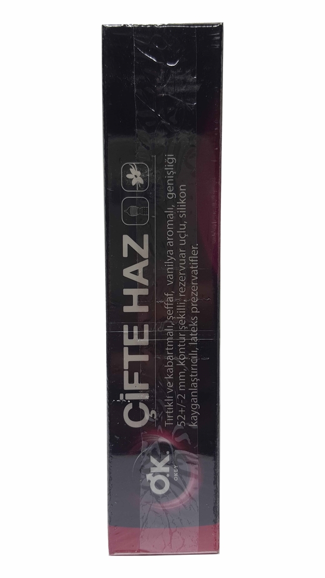 Vanilya kokulu, ince ve dayanıklı Okey Çifte Haz Prezervatif, daha fazla zevk sağlayan tırtıklı özel yapıya sahiptir.