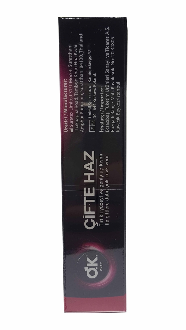 Okey Çifte Haz Prezervatif tırtıklı yapısıyla hissi ve zevki artırır, vanilya kokulu ve dayanıklıdır.