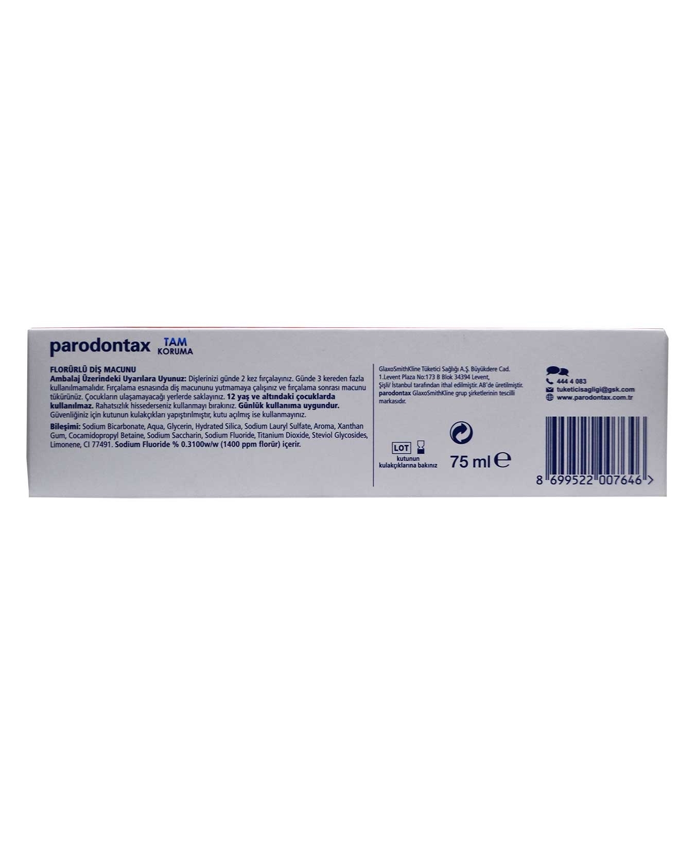 Parodontax Tam Koruma Diş Macunu, özel formülüyle, 8 farklı yönden tam koruma sunar. Diş minesini güçlendirir, nefesinizi tazeler, derinlemesine temizlik sağlar, dişlerinizi beyazlatır, diş etlerindeki şişme ve kızarmaları geçirir, diş etlerini güçlendirir ve plak oluşumunu engeller.