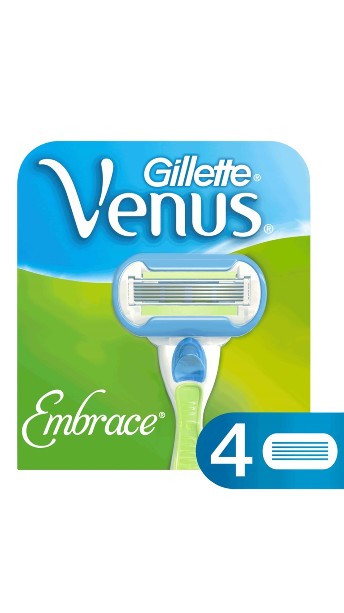 Gillette Venus Embrace 4'lü Kadın Yedek Tıraş Bıçağı! 5 bıçakla temizlik şimdi çok daha kolay! Gillette Venus EmbraceTıraş Makinesi kadınların zaman kazandıran tıraş sırrıdır. Mükemmel pürüzsüzlük için tıraş makinesini kullanmanız yeterli. Entegre kayganlaştırıcı barları pürüzsüz bir tıraş için zengin vücut yağları içerir.Venus Embrace 5 bıçaklı kadınlar için tıraş makinesiyle kendinizi şımartın! Üstelik şimdi 2 yedeği ile birlikte!