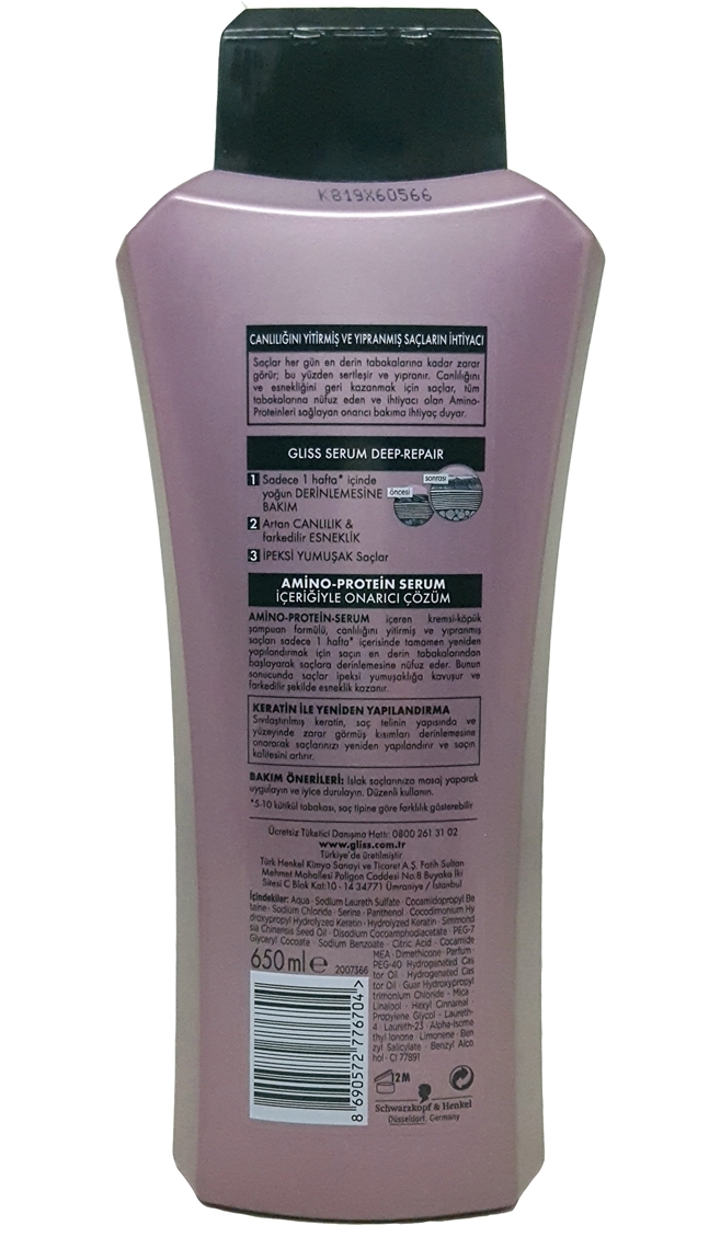 Kurumuş ve yıpranmış, cansızlaşmış saçları tedavi etmesi için geliştirilen Gliss Serum Deep Repair Şampuan, içerdiği doğal aminoasit ve proteinler sayesinde saçları onarır, güçlendirir, saçlarınızın yeniden parlak ve sağlıklı olmasını sağlar.