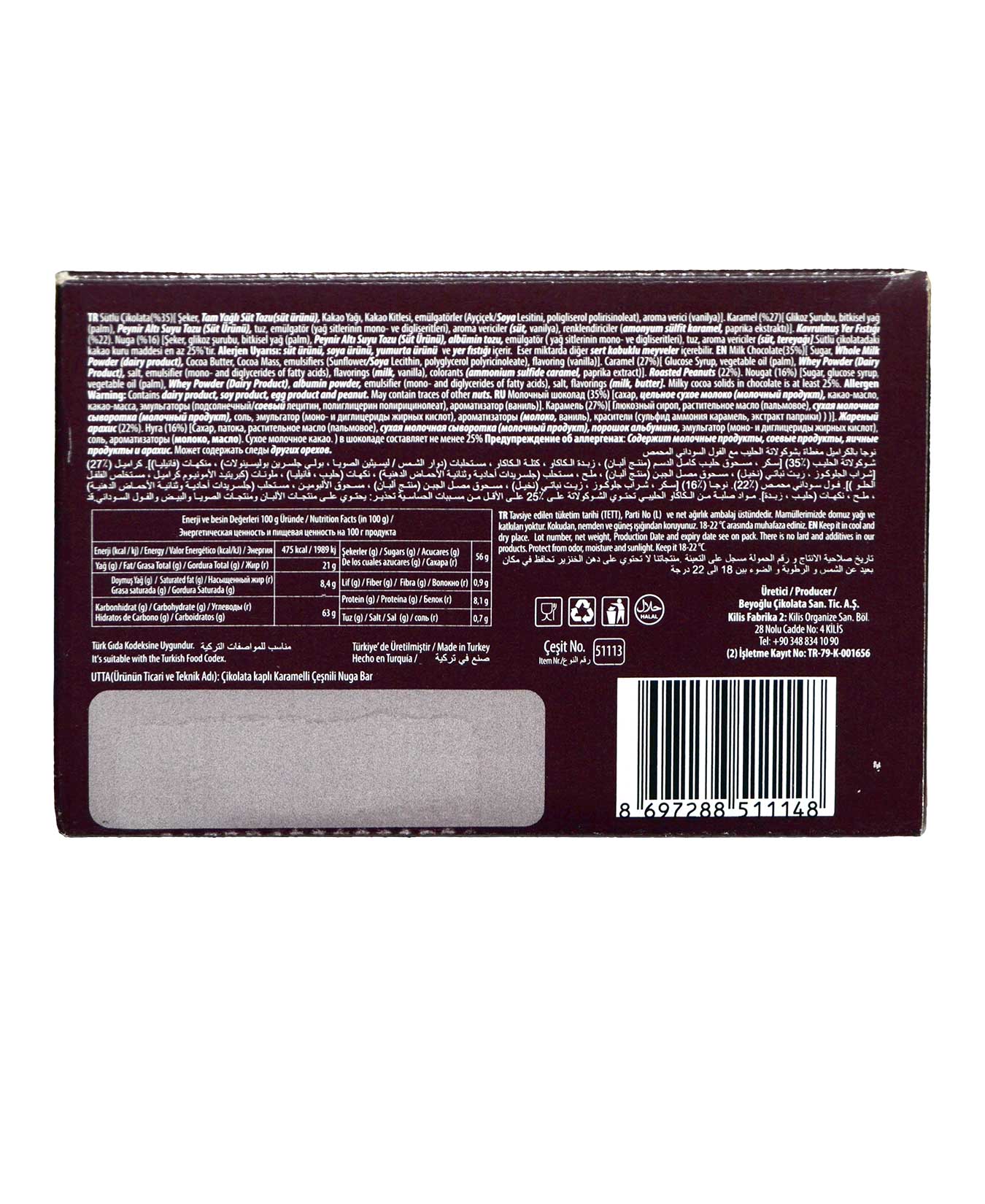 Beyoğlu Fıstık Çikolata Kaplı Yerfıstıklı Karamelli Nuga 50 gr 8697288511131