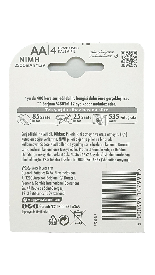 P-Duracell AA Recharge Turbo 4'lü 2500 mAH Şarj Edilebilir Kalem Pil 5000394107991