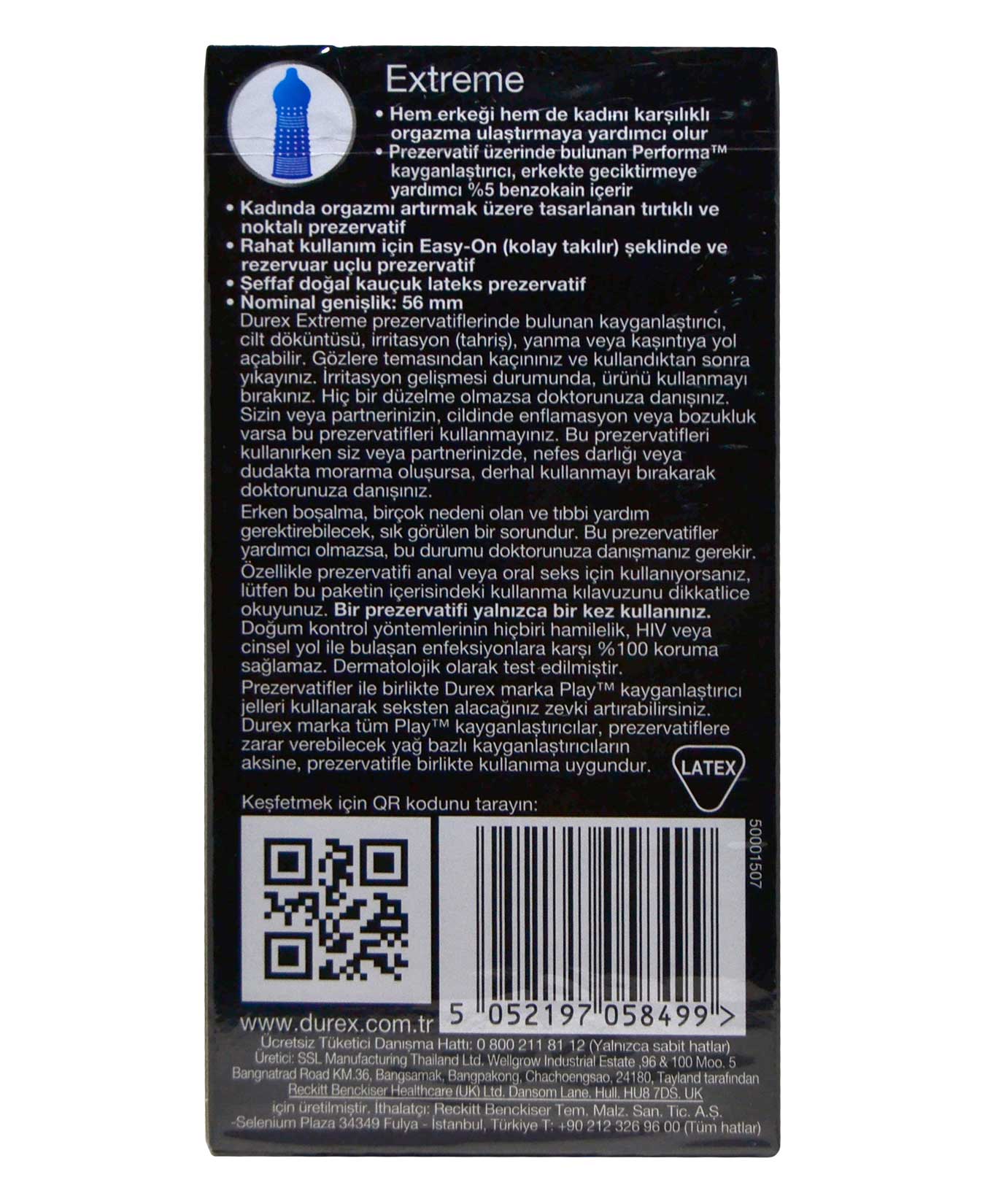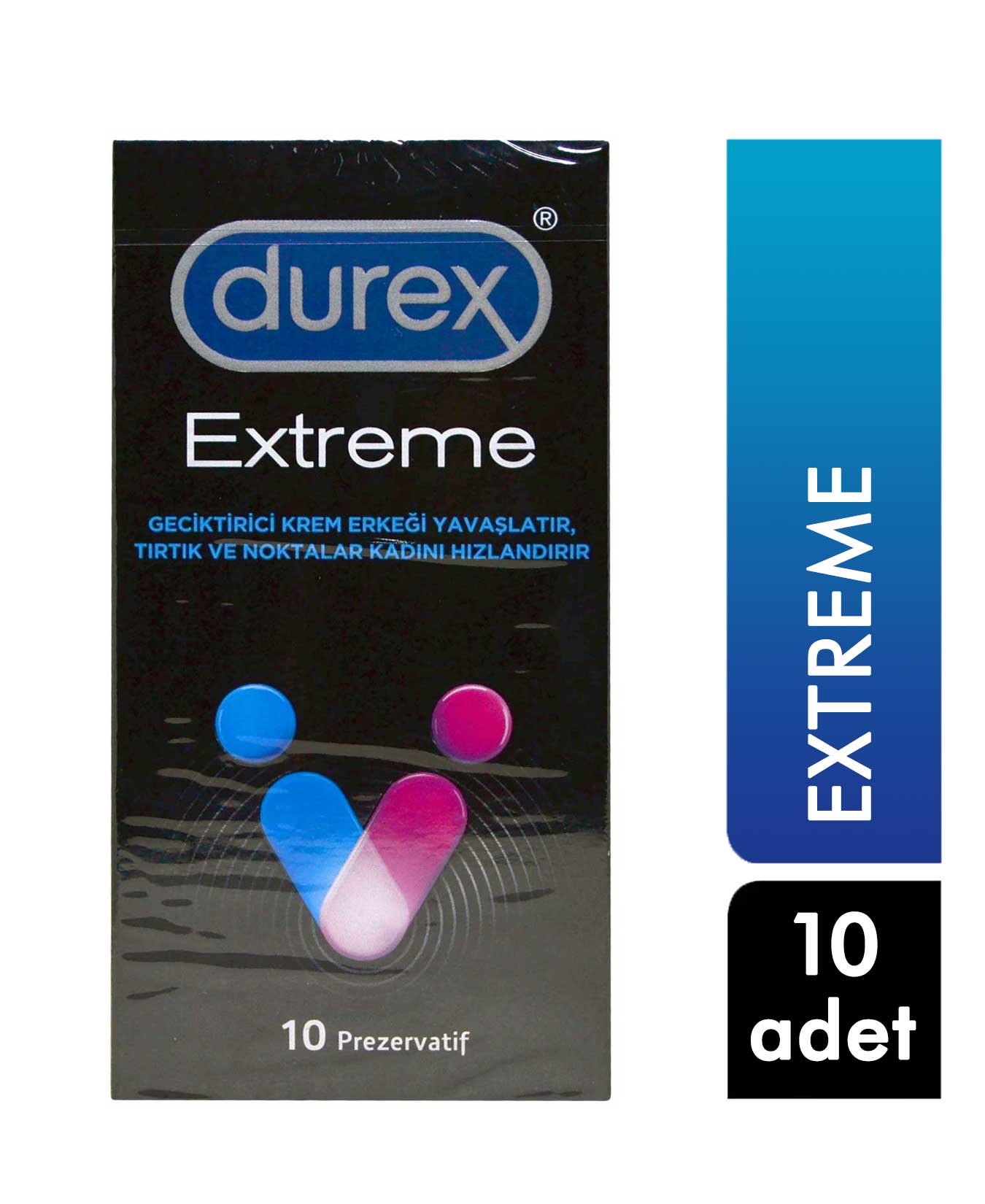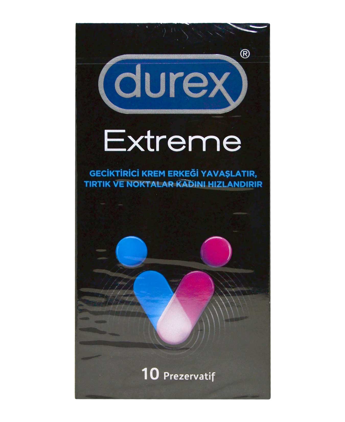 Durex Extreme Prezervatif geciktirici krem içeriği ile erkeği yavaşlatırken tırtıklı yapısıyla kadını hızlandırır.