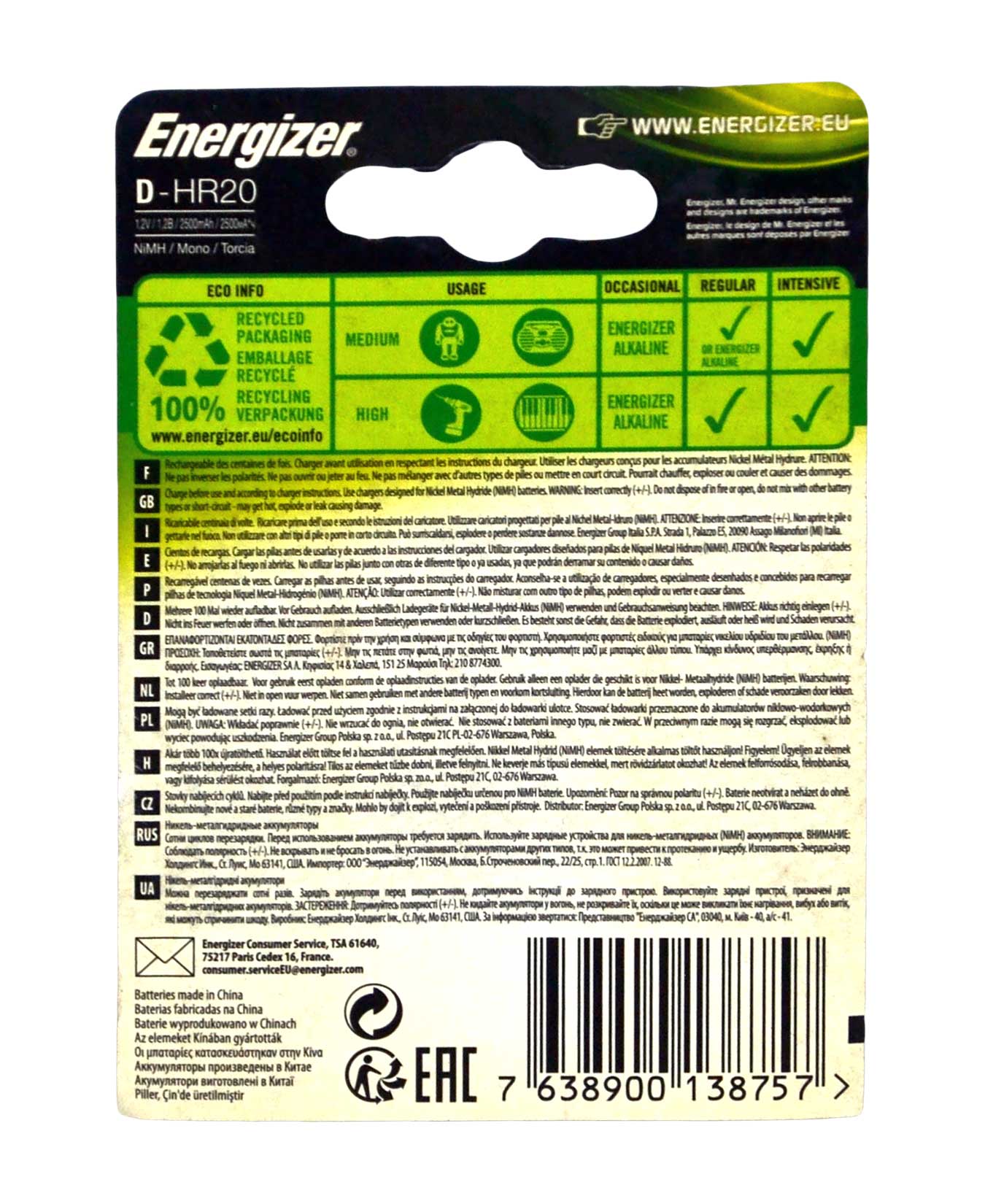 Energizer Accu Recharge Power Plus D Battery 2500 mAh 2 pcs 7638900138757