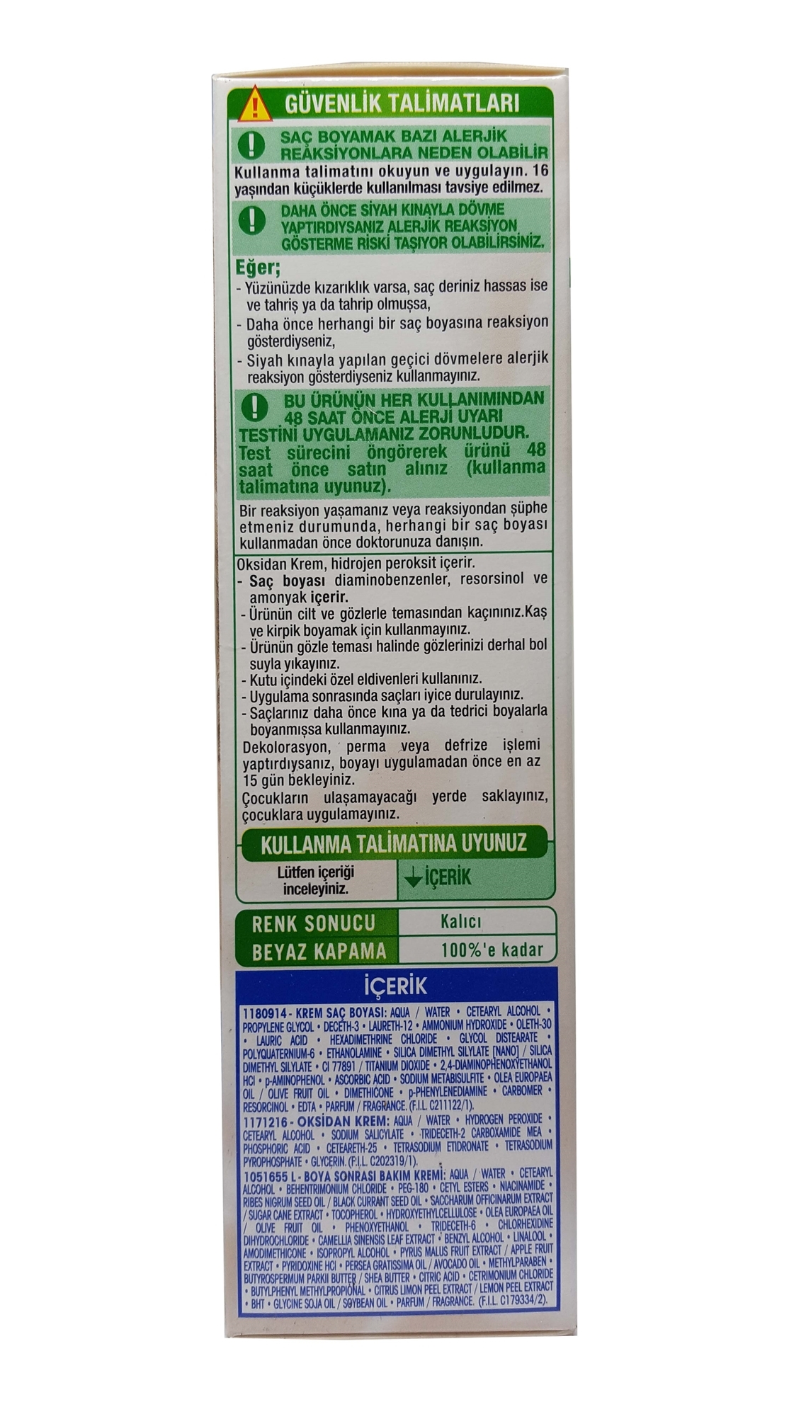 Bitkisel yağlar ile saçınızı besleyen kalıcı krem saç boyası. Saça derinlemesine nüfus ederek rengi hapseder, %100 beyaz kapatır.