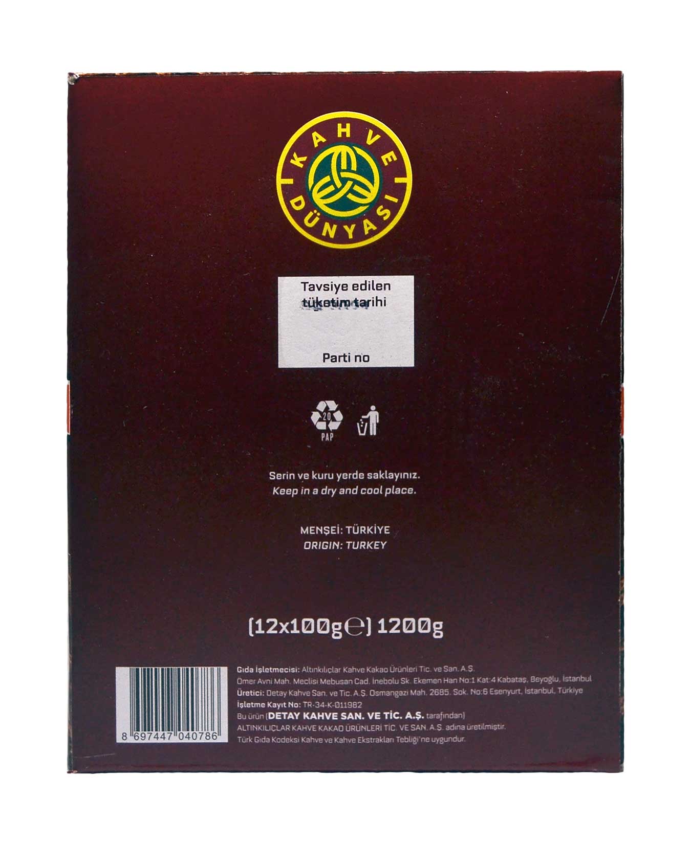 Kahvesinde farklı aromalar ve çekirdeğin içerdiği diğer doğal meyve ve bitki tatlarını istemeyenler için özel olarak kavrulan çekirdeklerden çekilen Kahve Dünyası Orta Kavrulmuş Türk Kahvesi keskin ve yoğun kahve tadına sahiptir. Daha uzun kavurma süresi sayesinde yağlar, esanslar ve diğer aromalar arınarak geriye sadece yoğun ve saf kahve tadı kalır. Kahve Dünyası Türk Kahvesi Çok Kavrulmuş 100 gr Paketi Fmcgstore'ye özel fırsatlarla ve en ucuz toptan fiyatlarla satın alın.