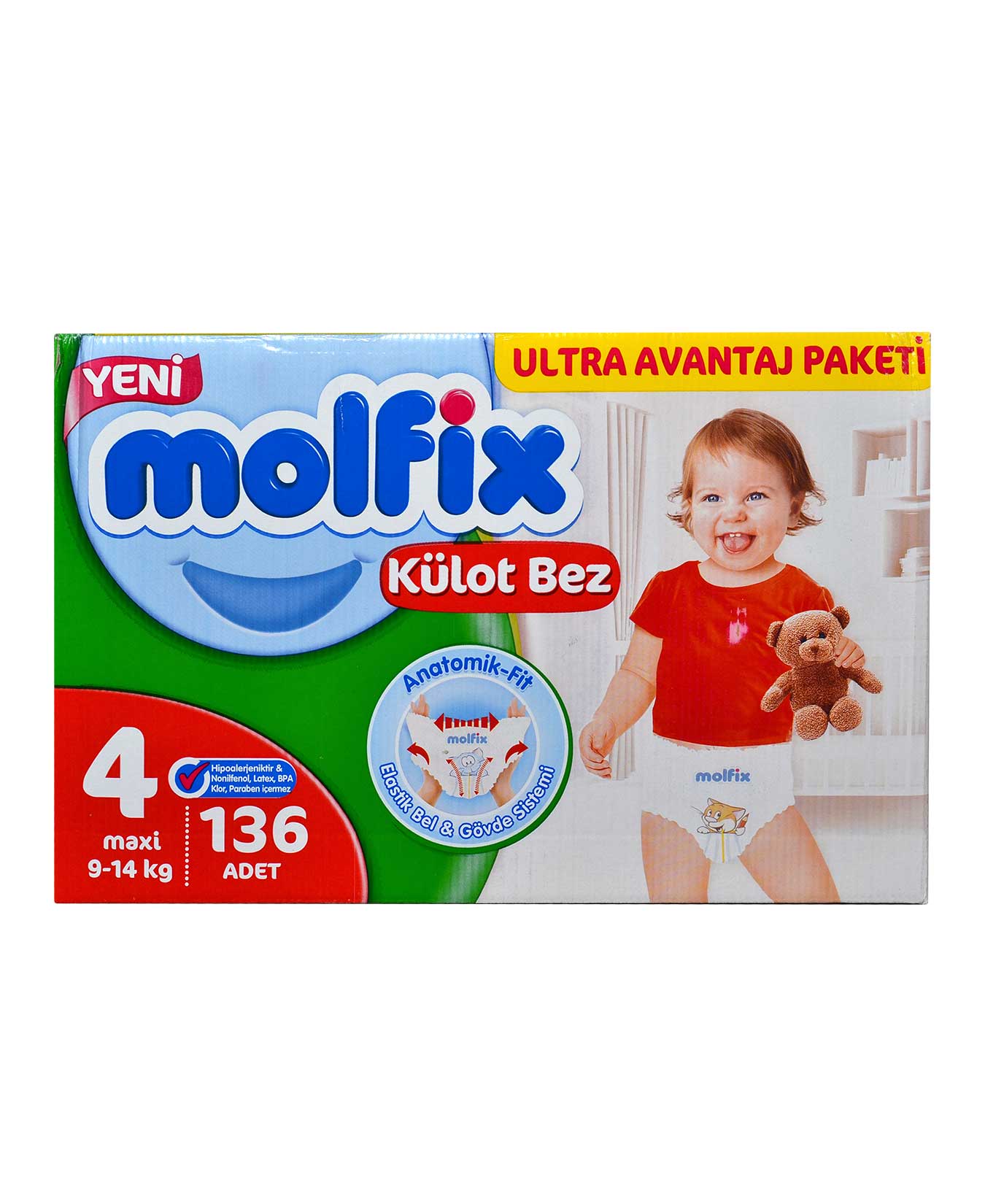 Molfix Panty Baby is comfortable with its 3-dimensional elastic body system and has a structure that absorbs and traps the liquid very quickly. Its natural material, which does not contain paraben, sls, chlorine, latex, pba, is hypoallergenic. Thanks to its absorbent surface and channels, it traps the liquid and keeps your baby dry. Molfix Panty Diaper keeps your baby dry all day long and is easily put on and taken off. Molfix Panty Baby Diapers 136 pcs Ultra Advantage Package 4 Maxi 9-14 kg at Fmcgstore with the cheapest prices!
