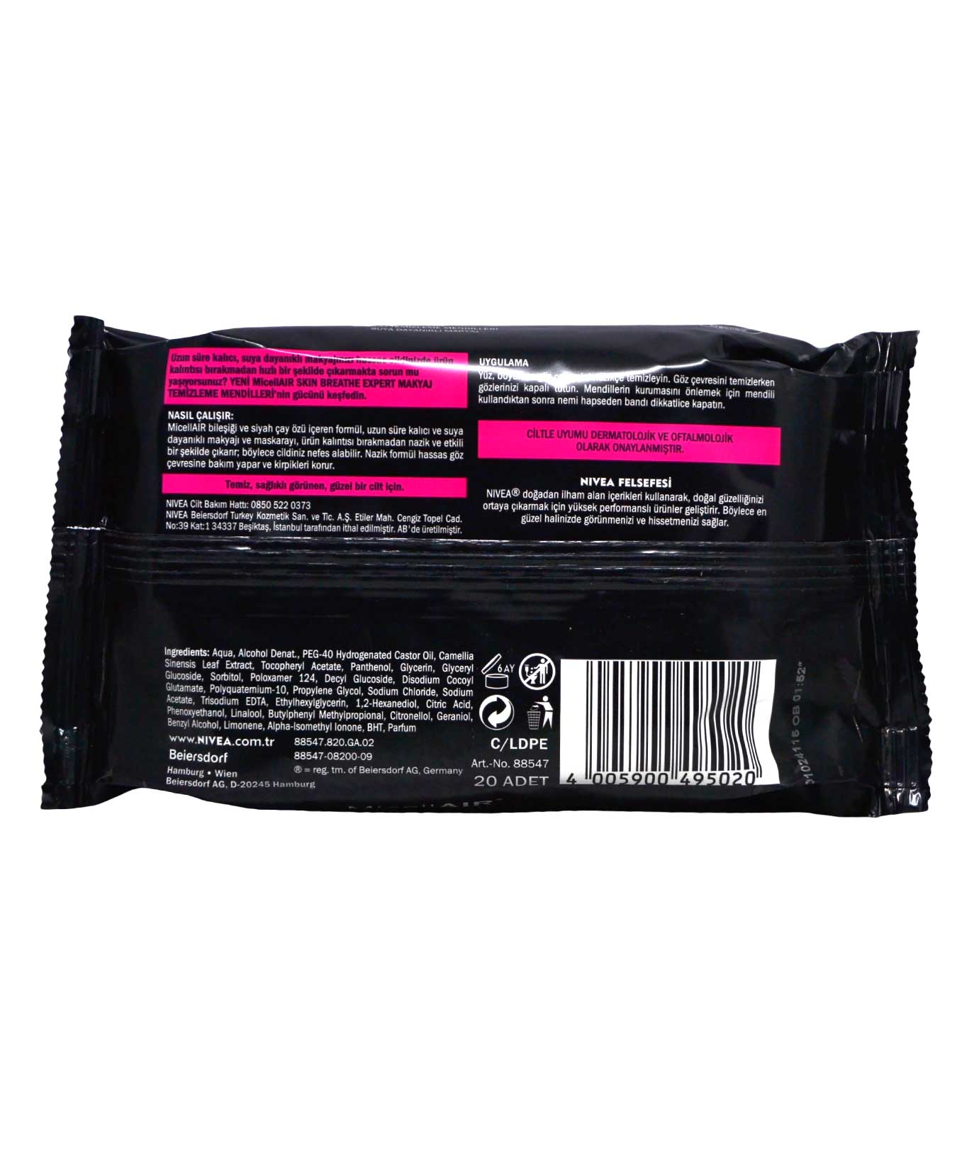 Nivea Make-Up Remover Wipes with a formula containing MicellAir and black tea extract allows you to easily and gently remove even the thickest, water-resistant, permanent make-up without leaving residue and wearing the skin. The sensitive formula specially developed for the eye area and eye provides easy and effective cleaning without damaging the eyelashes.
