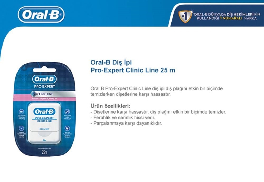 Oral-B Pro-Expert Clinic Line: Diş fırçasının ulaşamadığı yerlere ulaşır ve bakteri plağını temizler. Oral-B Pro-Expert Clinic Line diş ipi, diş fırçanızın ulaşamadığı yerleri temizler. Özel olarak tasarlanmış ip dokusu ile bakteri plağı temizliğini kolaylaştıran polimer kaplamayı bir araya getirir. Diş arasına geçirmesi kolaydır ve parçalanmaya ya da kopmaya karşı dirençlidir, bu sayede dişleriniz arasında kayarken parçalanmaz. Diş arasına geçirmesi kolaydır. Parçalanmaya ve kopmaya karşı direnç özelliği ile size kolaylık, konfor ve güvenlik sağlar. Dişleriniz arasında kolaylıkla hareket eder.
