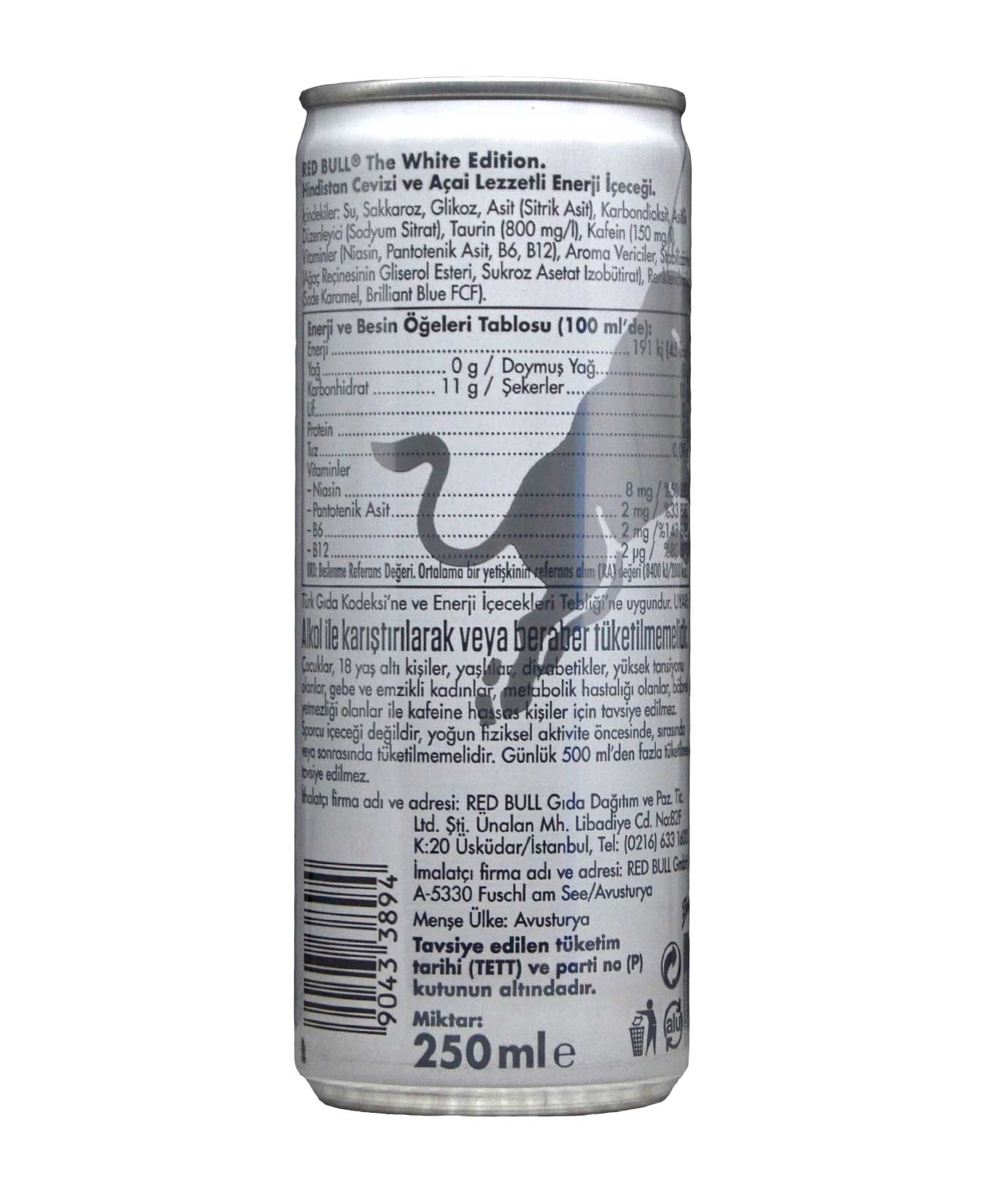 The special formula of Red Bull Energy Drink White Edition contains high quality ingredients. These components; It is Caffeine, Taurine, Group B Vitamins, Sugar and Alpine Spring Water.