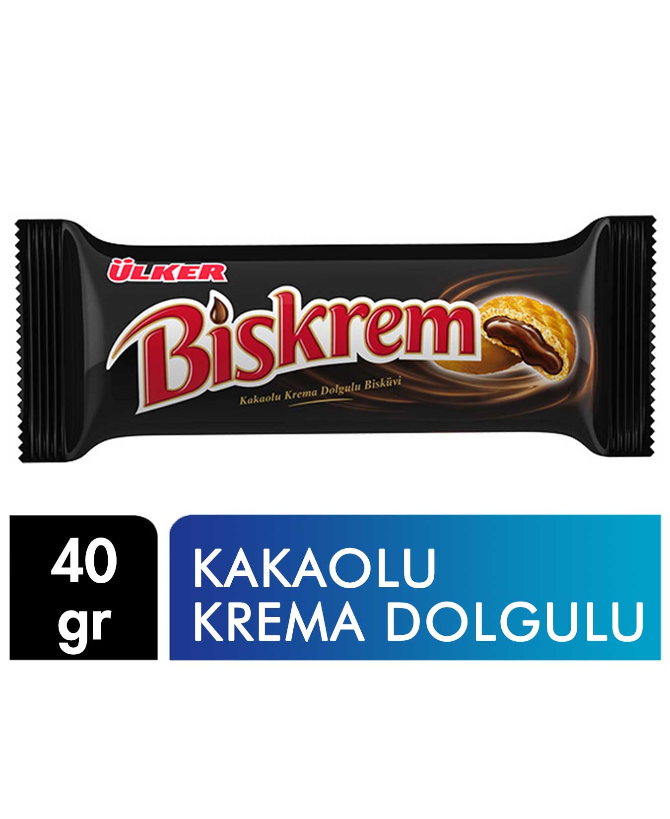 Ülker Biskrem Biscuit With Cocoa Cream Filled With its intense cocoa cream filling, 40 g plain biscuit adds flavor to your chats along with coffee, tea and other soft drinks.