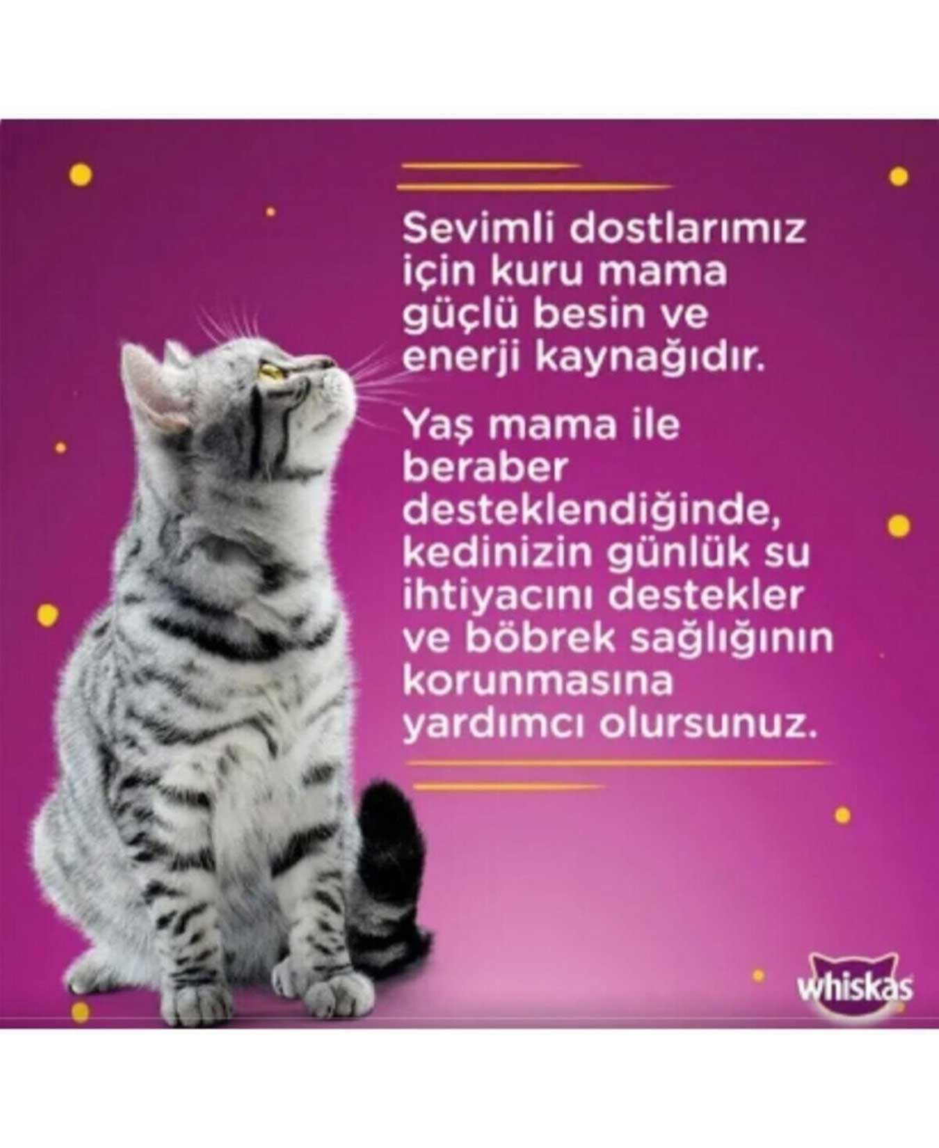 Yapay tatlandırıcı, renklendirici ve koruyucu içermeyen Whiskas Kedi Maması içeriğindeki ton balığı parçaları ve gravy sosuyla kedinizin keyifle yemesi için geliştirildi. Lezzetli ve hoş kokulu aromasıyla kedileri mutlu eden Whiskas Kedi Maması, kemik ve diş gelişimini hızlandırır ve güçlendirir, sindirimi kolaylaştırır ve kedinizin gün boyu tok, mutlu ve enerjik kalmasını sağlar.